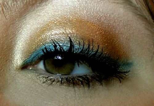 Den “Jelly-Gold” Look habe ich mit türkisfarbenem Puderlidschatten und der Agnes b. Ultracils Smoking Noir Mascara kombiniert. Nach dem Auftrag war der Lidschatten erstmal absolut top. Der Glanz war Wahnsinn und auch sonst war ich sehr zufrieden mit dem Auftrag. Goldglanz pur … zuerst ….