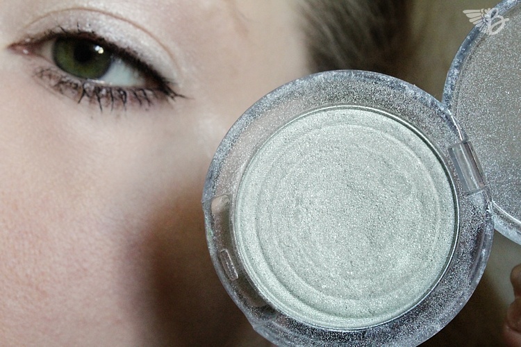 Der Puderlidschatten wird bis unter die Augenbraue ausgeblendet und auch an der Schläfe aufgetragen. Er enthält kleine Glitzerpartikel die wunderschön frostig aussehen.