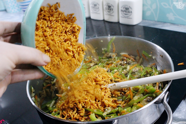 Den Uncle Bens Express Reis noch in der geschlossenen Packung kurz durchkneten, zum Auflockern, und dann zum Gemüse geben. Der Reis selbst ist etwas härter als fertig gegarter Reis und braucht noch seine 2 Minuten um fertig zu werden. Normalerweise würde ich hier jetzt noch etwas Wasser zugeben. Das ersetzen wir aber in diesem Rezept gleich durch die Tomatenpulpe.